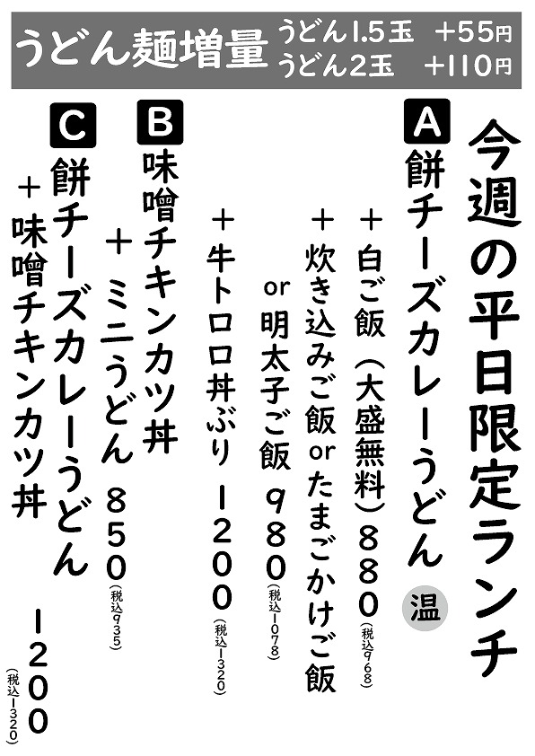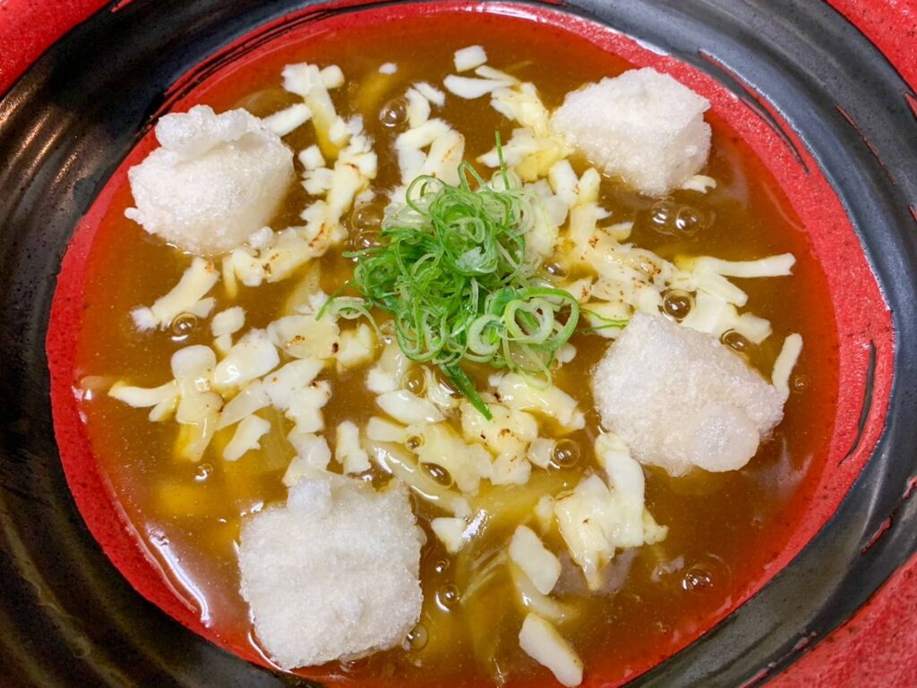 当店自慢の特製カレーうどんに、熱々のお餅と、コク深い濃厚なチーズをたっぷりトッピングしました。
